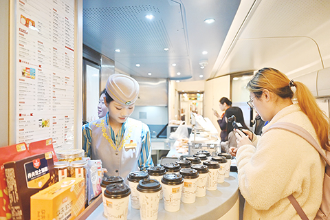 ◎ 十二月廿五日,廣州東站,工作人員在廣深鐵路列車上為旅客提供便民輕餐食。當日,國鐵廣州局首次在廣深鐵路列車上推出便民輕餐食。據介紹,廣深鐵路作為連接廣州、東莞、深圳的「黃金通勤走廊」,日均服務大量高頻往返旅客。便民輕餐食讓列車化身「通勤能量站」,有效節省旅客通勤備餐時間。(中新社記者陳楚紅 攝)