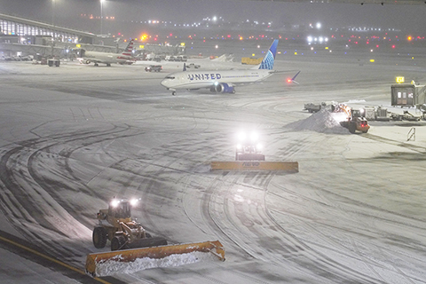 ◎ 美國東北部十二月二十六日大雪天氣影響,當天近一千五百架次航班被取銷,近六千架次航班延誤。圖為當日,鏟雪車在美國紐約拉瓜迪亞機場清理積雪。(新華社記者 張鳳國 攝)