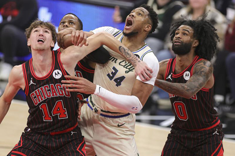 【中央社芝加哥27日綜合外電報道】美國職籃NBA密爾沃基公鹿「字母哥」(Giannis Antetokounmpo)今天傷癒歸隊繳出29分與8籃板,率領公鹿以112比103撞倒公牛,終結公牛5連勝。