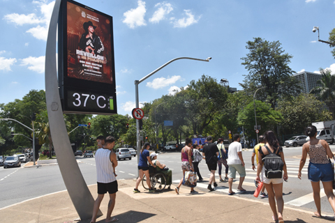 ◎ 當地時間十二月廿七日,巴西聖保羅「避暑勝地」伊比拉布埃拉公園,氣溫監測站錄得卅七攝氏度,市民在烈日下過馬路。自當地時間十二月廿四日起,熱浪侵襲巴西。巴西國家氣象研究所對聖保羅州、里約熱內盧州、米納斯吉拉斯州、南馬托格羅索州、聖埃斯皮裡圖州等該國東南部、南部和中西部多個地區發佈紅色高溫預警,警報持續至十二月廿九日。(中新社記者 林春茵 攝)