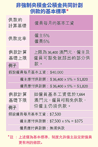 根據第7/2017號法律《非強制性中央公積金制度》,公積金共同計劃以僱員每月的基本工資作為供款計算基礎,供款金額為供款計算基礎的5%。倘僱員當月實際基本工資扣除供款後低於上述最低工資金額,僱員可豁免供款,而僱主則仍須供款;倘僱員當月實際基本工資超出最低工資金額五倍,則僱主及僱員均無須就超出的部份供款。最低工資金額調升後,公積金共同計劃的供款計算基礎下限調升至7,664澳門元,上限則上調至36,400澳門元。