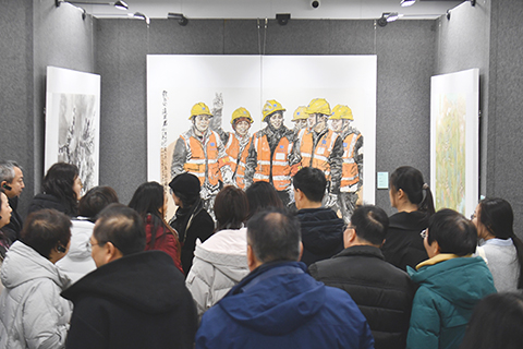 ◎十二月三十一日,「雄安.生生不息」中國畫主題創作展在雄安圖書館啟幕。本次展覽以「新時代綠色生態宜居城市建設」為主題,匯聚中國老中青三代優秀藝術家的七十七幅精品力作。藝術家們三次深入雄安新區採風寫生,以工筆、寫意等多樣中國畫技法,聚焦雄安建設者風貌、城市新貌與生態美景,既有對傳統筆墨的繼承發揚,更有對時代精神的創新表達,讓觀眾在藝術審美中感受「未來之城」的創新活力和綠色智慧。圖為藝術愛好者在《新區的建設者》作品前參觀。(中新社記者 韓冰 攝)