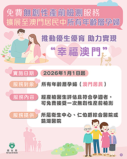 衛生局把無創性產前檢測(NIPT)服務擴展至澳門居民中所有年齡層的孕婦,有助更多家庭尤其高風險孕婦及早獲取關鍵的產前健康資訊,從而作出更適切的醫療與家庭規劃,以減輕家庭經濟與心理負擔,助力實現「幸福澳門」施政願景。倘有疑問,可於辦公時間內致電查詢熱線:八三九0八二四0。◇