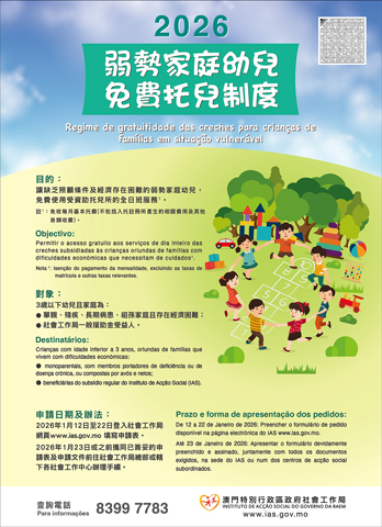 【特訊】社會工作局協調三十多間受資助托兒所推出「弱勢家庭幼兒免費托兒制度」,期望為缺乏照顧條件及經濟存在困難的弱勢家庭幼兒,提供申請免費使用受資助托兒所服務,於二0二六年一月十二日起接受申請。