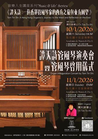 【特訊】天主教澳門教區轄下聖庇護十世音樂學院將於本月十及十一日在該院演奏廳分別舉行《譚天詩:一位香港管風琴家的西方之旅與東方回望》及《譚天詩管風琴演奏會暨管風琴啓用儀式》,歡迎有興趣人士報名參加。