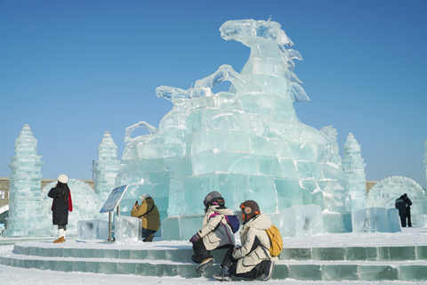 ◎ 一月五日,黑龍江哈爾濱,第四十二屆中國.哈爾濱國際冰雪節在冰雪大世界開幕。本屆冰雪節以「冰天雪地,共創未來」為主題,推出十大冰雪旅遊精品線路,舉辦二百餘項冰雪文化、體育和經貿活動。作為中國首個以冰雪為主題的國際性節慶活動,哈爾濱國際冰雪節已走過四十一載春秋,是世界四大冬令盛典之一。圖為遊客在冰雪大世界內拍照。(中新社記者 趙宇航 攝)