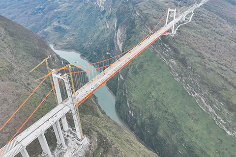 ◎ 一月六日,航拍主體工程完工的天門特大橋。近日,貴州安(順)盤(州)高速公路天門特大橋主體工程完工,目前已進入橋面附屬設施安裝工作。該大橋位於貴州省六盤水市境內,橫跨北盤江大峽谷。大橋全長一千五百五十三米,為主跨八百二十米的鋼桁梁懸索橋,橋面至江面高度為五百六十米,相當於二百層樓高,建成後將成為峽榖地區世界第三高橋、世界最高雙向六車道鋼桁梁懸索橋。(無人機照片)(中新社記者瞿宏倫 攝)