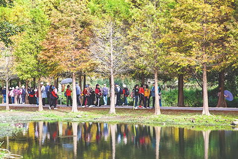 台灣桃園大溪月眉人工濕地生態公園,目前正是落羽松轉黃變色的季節,這裡約有三百多棵的水生落羽松,每到冬天來臨季節變化,落羽松便隨天冷而由綠轉黃再轉紅,色彩繽紛、美不勝收。落羽松隨風搖曳,枯木、落葉、湖水與和光影交織出濃濃的冬季浪漫迷人美景,令人陶醉而療癒。(香港中通社圖片)