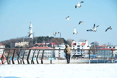 降雪雖給城市交通與生活帶來些許不便,卻為海岸線勾勒出別樣冬日風光。煙台第一海水浴場沿岸,海浪與積雪相映,海鷗翔集其間;威海「火炬八街」,銀裝素裹的道路延伸向大海,吸引眾多遊客駐足拍照。