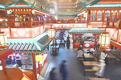 ◎ 一月十三日,在甘肅省敦煌市敦煌食局,遊人享受夜市生活。敦煌食局是有著多年歷史的沙州夜市升級改造而來,採用紅牆綠檐的仿古樓閣。該「局」呈現了敦煌飲食文化淵源、非遺小吃技藝與食材故事,還引入打卡遊戲等沉浸式感受敦煌飲食文化。敦煌食局是繼敦煌印局、敦煌書局之後,敦煌打造的新「局」。(中新社記者 李亞龍 攝)