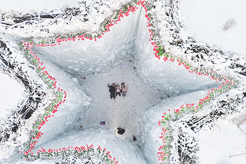 ◎ 一月十四日,在長春雲琅冰雪公園內,一組別具匠心的玫瑰冰雪景觀吸引了眾多遊客。(無人機照片)(中新社發王昌勝 攝)