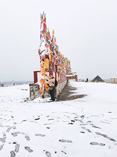 那天青海省忽然降雪降溫,令團隊遊興大減,但既然已經來到了景區,旅客們也只好冒著雨雪下車拍照,在青海湖邊築有亭台、祈福的佛塔及經幡,雖然遍地積雪,但岸邊還是有不少水鳥聚集;附近也有敖包,惟因天氣關係,只作短暫停留,未作深度遊。之後被安排到一家藏族民宿裡吃午餐,由於接下來沒有行程,加上天氣又冷,大家就在民宿裡到處閒逛,看看他們的地道商品,後來還在民宿裡飲下午茶,品嚐他們的地道美食,期間店主還為大家安排了藏族舞蹈表演。