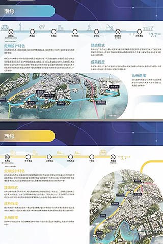 南線設有六個站點,包括作為轉乘西線及氹仔線的媽閣站、西灣站、南灣站、城市日站、皇朝站、轉乘東線的東城南站和港珠澳站,全長約七點七公里,將串聯大橋口岸與多個文化地標及旅遊名勝,以地下施工為主,僅口岸人工島段沿用預留的高架設計,跨海段工程將研究與AB通道以隧道形式共構。