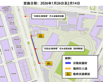 配合施工需要,1月26日日間路線首班車起,「白朗古/跑狗場」巴士站將往青洲大馬路方向臨時遷移約100米,供1(往媽閣)、5X(往皇朝)、23(往旅遊塔)、25B(往橫琴澳方口岸)、33(往筷子基)及N1B(往亞馬喇前地)路線乘客上落,至2月14日首階段有蓋行人道工程完成後將遷回原位。同時,原巴士站及相關區域將設為臨時行人道(詳見附圖)。