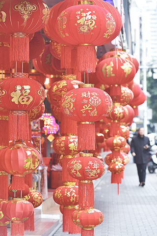 ◎ 一月二十五日,馬年春節臨近,福州街頭各商店新春飾品持續上新,吸引市民前來採購,節日的氛圍越來越濃。(中新社記者 張斌 攝)