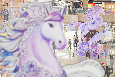 ◎ 一月二十六日,江蘇南京,七點二米高的馬年藝術裝置「淩霄獻瑞」吸引民眾目光。近日,南京德基廣場佈置名為「淩霄獻瑞」與「織夢新元」的馬年藝術裝置,將傳統文化與現代藝術相結合,營造喜慶氣氛,迎接新春佳節的到來。(中新社記者 泱波 攝)