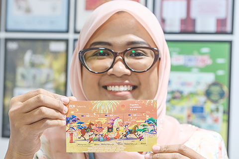 ◎ 為配合丙午馬年的到來,馬來西亞一月二十九日推出二0二六年農曆馬年郵票,一套售價二十林吉特(一林吉特約合零點二五美元)。圖為當天,在馬來西亞吉隆坡,一名郵局職員展示馬年郵票。(新華社發 張紋綜 攝)