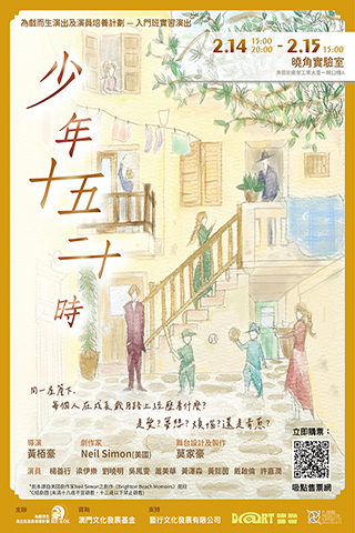 由曉角話劇研進社主辦的「為戲而生演出及演員培養計劃」入門班將於2月14至15日在曉角實驗室,上演美國劇作家紐.西蒙的自傳式輕戲劇《少年十五二十時》,以輕鬆佻皮的風格講述一個中下階層家庭成員間的溫馨成長故事。