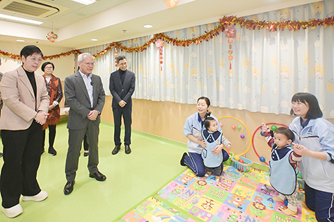 在社會文化司司長柯嵐及社會工作局領導陪同下,岑浩輝首先到訪澳門街坊會聯合總會屬下的小海鷗托兒所,了解托兒設施、照護幼兒流程和培育安排等。期間,岑浩輝不時與幼兒互動,歡笑聲不斷。隨後,岑浩輝一行轉往澳門婦女聯合總會的北區家庭服務中心探訪,聆聽中心代表介紹以促進家人間親密關係,預防家庭問題產生的社區支援服務,他亦與在場的服務使用者閒話家常,互相致以新春祝願。