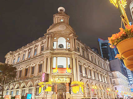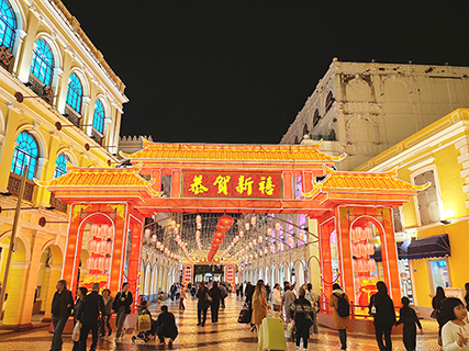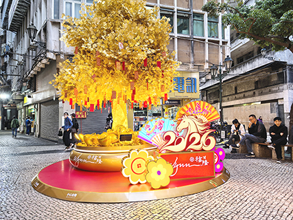 澳門迎接馬年的來臨,政府在各區擺放大型燈飾與花藝展,在中區的議事亭前地的燈飾是駿馬踏祥雲,寓意馬年充滿活力,馬具克服困難與飛躍的意象。在美麗活躍的大型燈飾,並配上嬌美的年花,傳遞新春的祝福。
