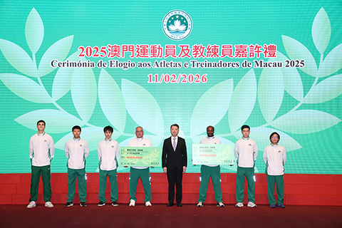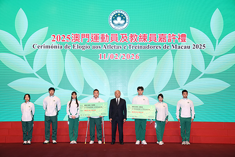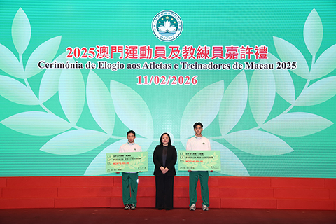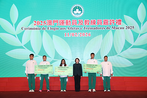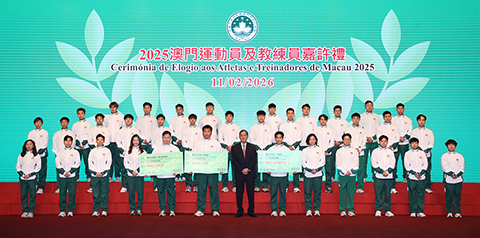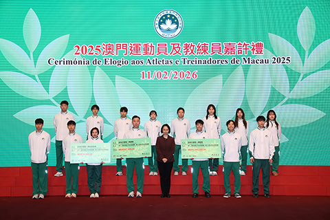 【特訊】為表彰在2025年度參加體育比賽中獲得優秀成績的本澳運動員、教練員及技術輔助人員,以及為鼓勵澳門體育代表團在今年各項大型體育賽事中創造佳績,「2025澳門運動員及教練員嘉許禮暨2026體育代表團誓師儀式」11日晚上七時半舉行,社會文化司司長柯嵐等出席儀式,勉勵並祝賀一眾運動健兒。