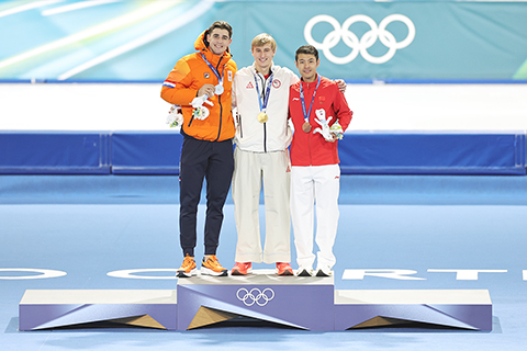 在速度滑冰男子1000米賽場,中國選手寧忠岩迎來本屆冬奧會首秀,他以1分07秒34摘得銅牌,實現中國隊在該項目上的成績突破。這也是他個人首枚冬奧獎牌,中國體育代表團由此獲得本屆賽會第三枚獎牌。美國名將斯托爾茲以1分06秒28的成績奪冠並打破奧運紀錄,荷蘭選手德布獲得銀牌。另一位中國選手廉子文因犯規被取銷成績。◇