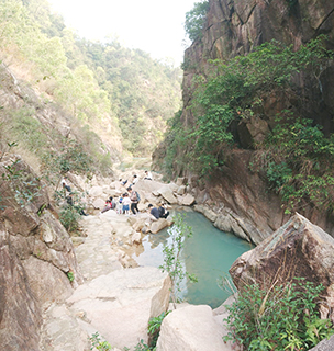 「小九寨溝」大部分位於懸崖峭壁中,縱眼看去,山旁的石路盤曲嶙峋、崎嶇逼仄、一眼看不到盡頭,仿佛造物主將大小不一的石塊灑在其中。山谷的溪流中石頭起伏綿疊,間以小瀑布串連,有敏捷的行山者在石頭上跳躍前行,像會輕功的武俠人士;有的步步為營,建議體力不支或腿腳不便的,原路返回或經山旁的階梯前進,遊玩時要小心看顧老人兒童。整個「小九寨溝」被高山和樹林包圍,隔絕高樓大廈的身影,也隔絕煩囂,走近會發現別有洞天,玲瓏小巧卻五臟俱全、亭台曲橋、溪流瀑布、鳥語花香、山谷涼風、林間晚霞,好不愜意!兩邊是巍峨陡立的峭壁,腳下是棱角分明的石頭,藍綠色的流水,陽光灑在潭水及樹葉上,不同色系的綠色呈現眼前,美不勝收!