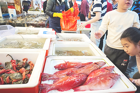 ◎ 二月十五日,福建福州,市民在市場挑選海鮮。福州各大海鮮市場迎來節前消費高峰,各類海產品備受市民青睞,市場購銷兩旺,年味十足。(中新社記者 呂明 攝)