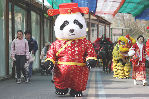 ◎ 二月十五日,江蘇南京,熊貓人偶在紫清湖野生動物世界內巡遊,營造濃濃的喜慶氣氛。(中新社記者泱波 攝)