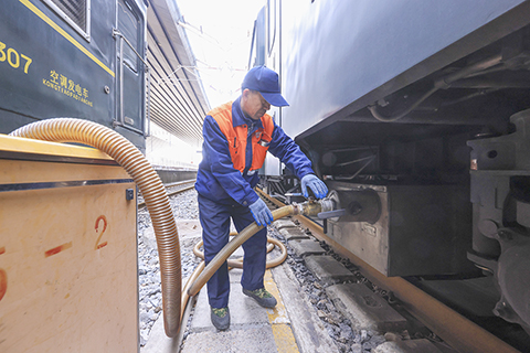 ◎ 二月十五日,工人頂著刺鼻的氣味認真開展作業。當日是春節假期首日,北京寒風陣陣。在北京西站,國鐵北京局北京車輛段的作業人員堅守在吸污作業一線,用平凡的堅守,保障春運列車的衛生與整潔。(中新社記者賈天勇 攝)