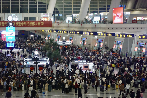 ◎ 二月十五日,旅客有序候車。春節假期首日,浙江杭州東站候車大廳內旅客往來穿梭,拖著行李箱的身影隨處可見。(中新社記者 劉子琳 攝)