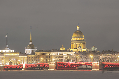 ◎ 二月十五日晚,俄羅斯聖彼得堡冬宮橋亮起「中國紅」,迎接馬年春節。(新華社發莫京娜攝)