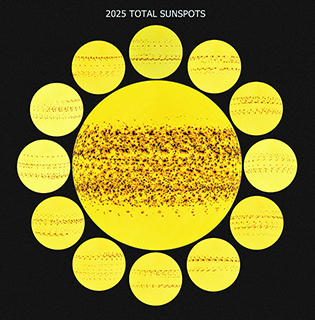 你能在太陽表面看到多少顆太陽黑子呢?精選影像展示了二零二五年一整年中太陽黑子的月變化的分佈:環狀排列的影像顯示每個月的黑子活動,並在中央疊加成一幅壯觀全景。太陽黑子是因為太陽強磁場抑制對流、導致局部溫度較低而形成,因此,在視覺上以深色斑點呈現。單一黑子的生命期可短至數天,也可能長達數個月。雖然這些精選影像來自美國太空總署的太陽動力學天文台,但其實只要使用小型望遠鏡或雙筒望遠鏡,並配備太陽濾鏡,就能安全地觀測到太陽黑子在適當條件下,甚至戴著日食眼鏡就能直接看見近期出現的超大型黑子群。