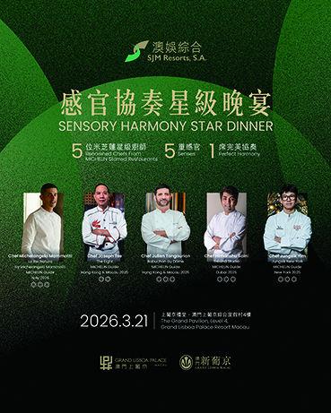 澳娛綜合度假股份有限公司將於3月21日在旗下澳門上葡京綜合度假村上葡京禮堂,呈獻由《米芝蓮指南》策劃的「感官協奏星級晚宴」,五位米芝蓮星級餐廳主廚將分別以視覺、聽覺、嗅覺、味覺、觸覺及五感為創作核心,將六道風味佳餚譜成廚藝頌曲,帶領賓客踏上美食之旅。