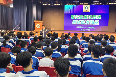 講座中,司警局人員深入淺出地向同學們,介紹與電腦犯罪及網絡欺凌相關的刑事法律知識,並與同學們就真實案例展開交流探討,藉此提升他們對相關犯罪手法和防範方法的認知。其後司警局人員與同學們進行圍繞防罪核心知識的「防罪連連看」互動遊戲,在輕鬆氛圍中鞏固防罪教育成效,幫助同學們強化守法觀念及自我保護意識。