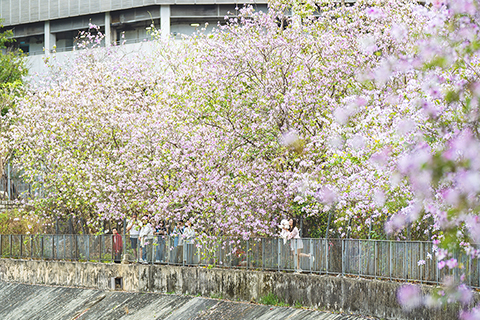 ◎ 三月一日,香港屯門地區兆康站附近的宮粉羊蹄甲盛開,吸引市民遊客前往欣賞春色。(中新社記者侯宇 攝)