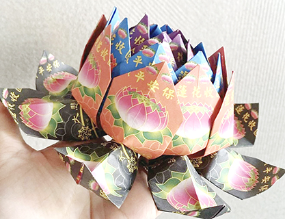 按網上資料所示,紙張被發明以後,紙張除用作書寫外,最初只被運用來包裹東西,偏實用性,及後佛教傳入,蓮花等宗教象徵物便開始以紙摺形式出現,後來紙錢、紙衣等折疊祭品也逐漸普及。南北朝時期,也出現了結構相對複雜的折疊工藝,唐宋時期,摺蓮花成為民間喪禮超度亡者的標準配置,明清時期,甚至出現多層花瓣、蓮台組合等複雜的形態,象徴佛教裡九品蓮台的概念。在台灣和福建,認為蓮花36瓣花加72瓣座等如108瓣,數字代表消除一百零八種煩惱。