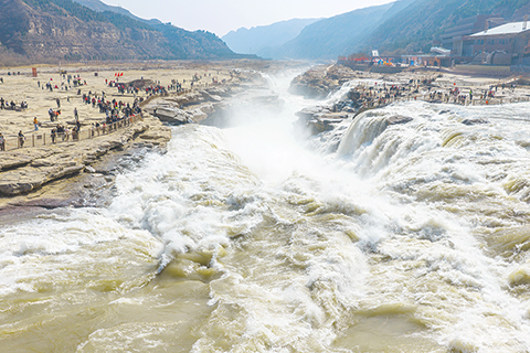 ◎ 三月三日,陝西延安,隨著氣溫持續回升,黃河壺口瀑布進入春汛期,此時瀑布水量充沛、氣勢雄渾。(無人機照片)(中新社發 霍勇 攝)