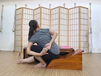 開始時,先在地上鋪上防滑墊,或坐在矮斜椅上;接著屈曲右腳,左腳伸直的同時,將大腿膝蓋往上提,展開膝蓋後方皮膚空間;同時拓展胸腔,保持脊柱向上延展;然後隨著兩側軀幹的延展,特別是右邊的側軀幹需要加倍延展。