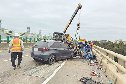 ◎ 三月九日,台灣一輛小貨車與一輛吉普車行經台61線桃園市觀音區路段時發生碰撞,並停在車道中央,後方一輛曳引砂石車見狀緊急閃避,雖未直接撞上,但車上泥沙傾瀉散落車道。隨後另一輛曳引槽車閃避不及,直接撞上停在路中的吉普車與小貨車,造成吉普車與小貨車司機當場死亡;之後又有一輛轎車接續追撞,該車司機及兩輛曳引車司機僅受輕傷。現場交通受影響三個多小時。(香港中通社圖片)