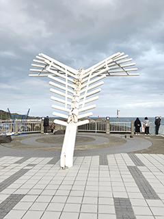 若嫌只觀海景,略感單調,步道上除設有座椅,還鋪陳了不少描繪海產的形象雕塑︰頂戴軍帽,伴插海旗的米黃色八爪魚,擠眉弄眼,淘氣活潑;紅藍魷魚雌雄相伴,心心相印,浪漫可愛,甜蜜温馨;末端的巨型雪白鋼管魚骨,齒牙交互,纖毫畢現,獨指雲天……均可供遊客打卡留念。
