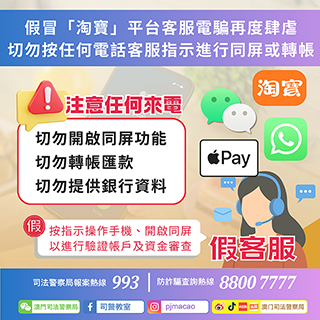 假冒「淘寶」平台客服電騙再度肆虐 司警局籲 切勿按任何電話客服指示進行同屏或轉帳