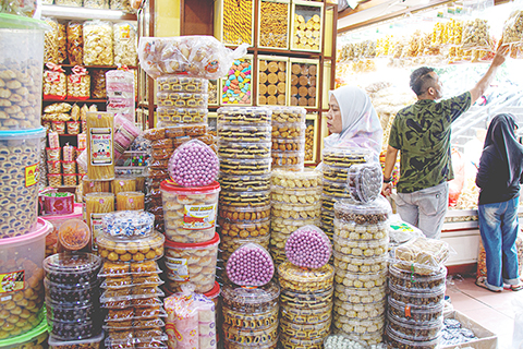 ◎ 三月十四日,在印度尼西亞萬隆,顧客購買糕點迎接開齋節。(新華社發 塞提安賈爾 攝)