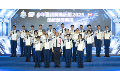 潮流文化盛事 「ComplexCon香港」開幕 「節水中國—活水‧行」步行籌款暨嘉年華圓滿舉行 少年警訊獎勵計劃二0二五金星頒獎典禮 香港「體重管理行動計劃×日行萬步挑戰」啓動禮暨嘉年華舉行 香港油價升高引關注 下月起每周公佈價格增透明度 香港何以成為中國文化出海「樞紐港」? 港郊野公園熱點 將試行預約制度 港葵涌一男子持長刀企圖襲警 遭警開五槍中彈被送院 丘應樺憶祖父丘逢甲 家國情懷代代相傳 香港擴低空經濟場景 目標上半年推試點 英國南部暴發腦膜炎 港衛生署加強機場監測 紅磡發生金條盜竊案 四男一女被捕 起回全部九千多萬元金條 少年警訊獎勵計劃二0二五金星頒獎典禮 2026-03-22 03:30:00 ◎ 三月廿一日,香港警務處舉辦「少年警訊獎勵計劃二0二五金星頒獎典禮」。警務處處長周一鳴(中)頒發金星章予少年警訊會員。(香港中通社圖片)