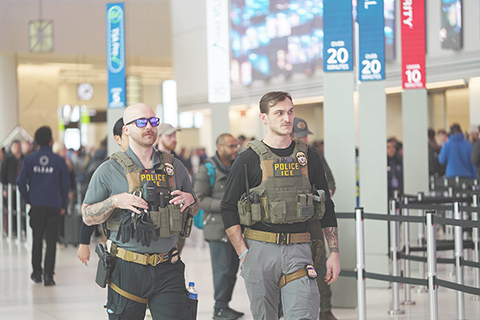 ◎ 隨著美國土安全部及其下屬機構持續「停擺」,全美機場安檢系統受到明顯影響。美國總統特朗普決定,從三月二十三日開始向美國機場派遣移民執法人員負責安保工作。圖為當日,移民與海關執法局的執法人員在美國紐約拉瓜迪亞機場的出發安檢處執勤。(新華社記者 張鳳國 攝)