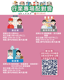 【特訊】為持續推動就業配對,協助本澳居民就業、回應業界人力資源需求和壓力,勞工事務局(下稱「勞工局」)與澳門工會聯合總會(下稱「工聯」)續辦三場行業專場配對會,合共提供四百一十五個職位空缺。報名期由今(二十六)日上午九時起至三月三十日中午十二時止。