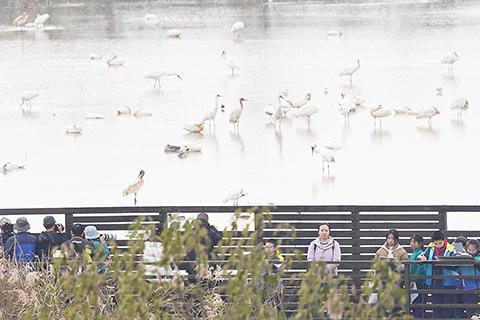◎ 白鶴等候鳥在鄱陽湖畔的江西省餘干縣白鶴洲棲息(二0二六年二月廿七日攝)。(新華社記者萬象 攝)