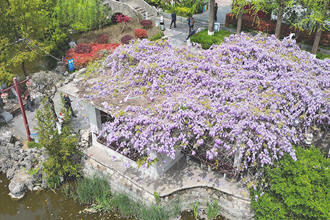南京600多歲紫藤花開如瀑 2026-04-08 03:30:00 ◎ 四月七日,江蘇南京,鄭和公園內有著六百多年樹齡的紫藤進入盛花期,繁花垂帘如瀑,蔚為壯觀。據悉,這棵紫藤為南京市一級古樹名木,編號八二六,虬枝蒼勁古樸。(無人機照片)(中新社記者泱波 攝)