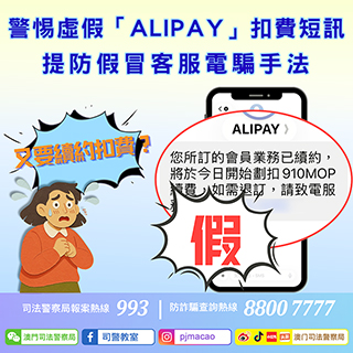 司警局近日接獲多名市民檢舉,報稱收到假冒「ALIPAY」詐騙短訊,內容訛稱「所訂的會員業務已續約,將會扣取費用」,誘騙市民回撥短訊內附帶的電話號碼。當有市民上當回電,騙徒便會冒充淘寶、支付寶或銀行職員,索取銀行或信用卡資料、要求下載APP進行同屏,或轉帳至指定戶口。