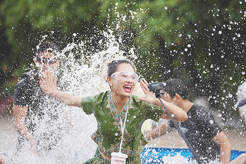 ◎ 四月十日,雲南昆明,雲南民族村景區一年一度的潑水節活動正式啟幕,眾多遊客參與其中,共赴歡樂。圖為工作人員與遊客互動。(中新社記者 劉冉陽 攝)